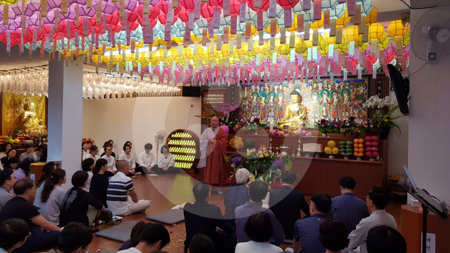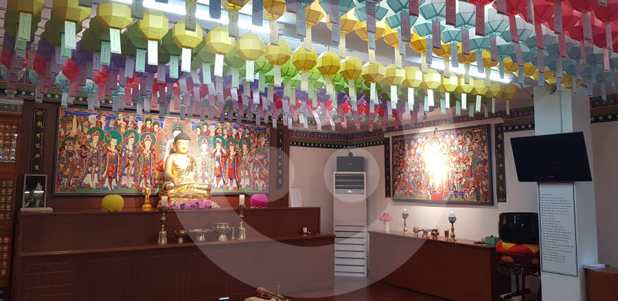 In July 2012, an eye-dotting ritual was conducted to consecrate Buddhist altar paintings, symbolizing the completion of the Dharma hall. The temple conducts regular Dharma services, including monthly ceremonies on the first day of the lunar calendar, rituals venerating Avalokitesvara and Kstigarbha Bodhisattvas, as well as weekly Sunday Dharma services for families. It also commemorates significant Buddhist events like Buddha's Birthday and All Souls’ Day (Ullambane). At present, Haeinsa Pogyowon has approximately 150 families and 250 individual followers registered with the temple. It actively participates in community activities, fostering friendship and engaging in volunteer work such as visiting local nursing homes and aiding the less fortunate, including offering scholarships. The temple places a strong emphasis on nurturing the mind and cultivating a spirit of generosity among its members.
