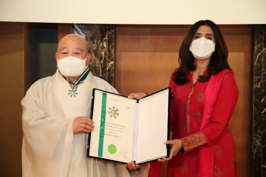 ‘The Star of Pakistan,’ a civil award by the government of Pakistan, was conferred on Most Ven. Wonhaeng in an investiture that took place on November 11, 2021, in Lotte Hotel, Seoul in recognition of his role in promoting world peace by strengthening the ties between Korea and Pakistan and improving inter-religious relations. Ambassador Mumtaz Zahra Baloch, as the representative of the Pakistani government, awarded him with the honor.
