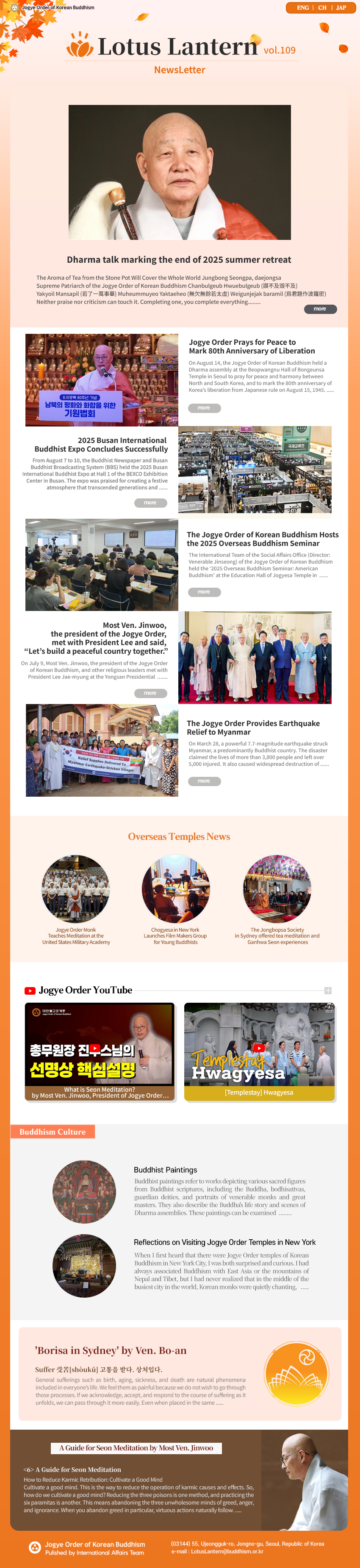 Lotus Lantern Vol.109 News Letter Page information Author Jogye On25-09-22 14:29 Views499 Comments0 Related links Next List Body Lotus Lantern vol.109 Next List